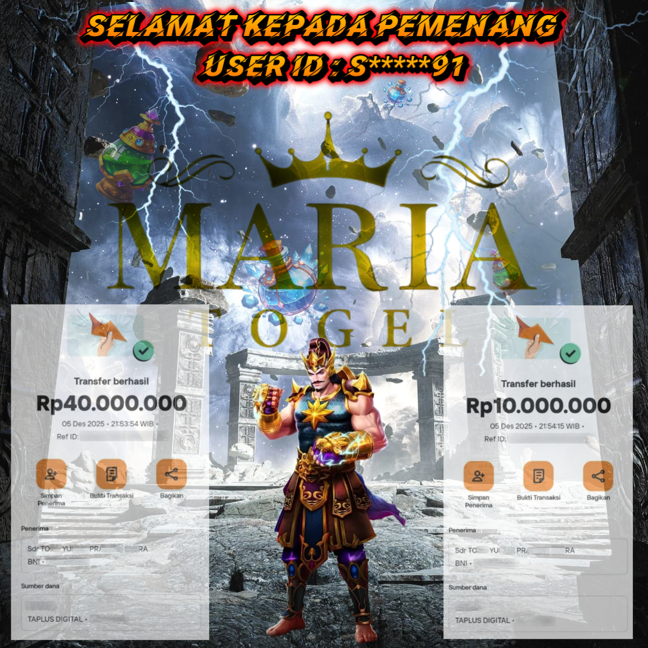 MARIATOGEL berprinsip FAIRPLAY dan KEJUJURAN karena KENYAMANAN dan KEAMANAN member adalah PRIORITAS UTAMA kami SEKALI LAGI.. SELAMAT ATAS KEMENANGANNYA KEPADA USER ID : sk********91 Ayo segera bergabung bersama kami dan dapatkan hadiah dan pengalaman bermain terbaik cuma di MARIATOGEL